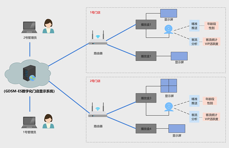 该客户为宁波地区零售门店,在一段时间内,客户发现门店销售额持续下滑,但是不知道原因出在哪里,到底是消费者减少,还是广告推送出现问题,亦或是其他原因,客户没有头绪,www.凯发科技数据化门店显示系统完美的解决了客户痛点,方案拓扑图如下:
