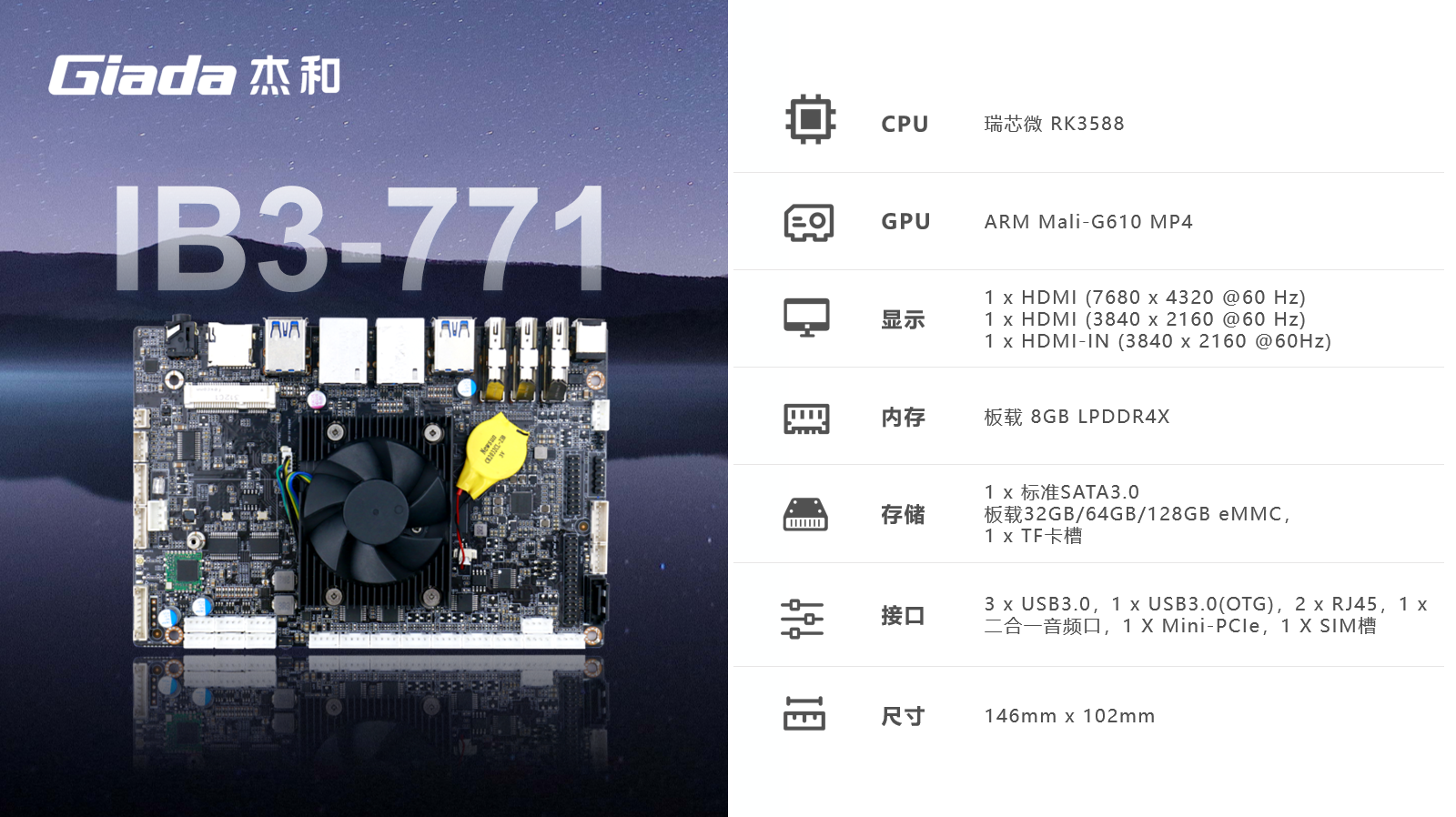 www.凯发ARM主板IB3-771采用瑞芯微RK3588(4*A76+4*A55@2.4GHz)八核64位处理器,集成ARMMali-G610 MC4 GPU,内置AI加速NPU,提供6TOPs算力,板载8GB LPDDR4X内存,支持8K@60fpsH.265/VP9视频解码和8K@30fps H.264视频编码,进行图像及视频的高效采集和处理,可广泛应用于交互式智慧显示屏、智慧显示一体机、智能自助终端等场景。