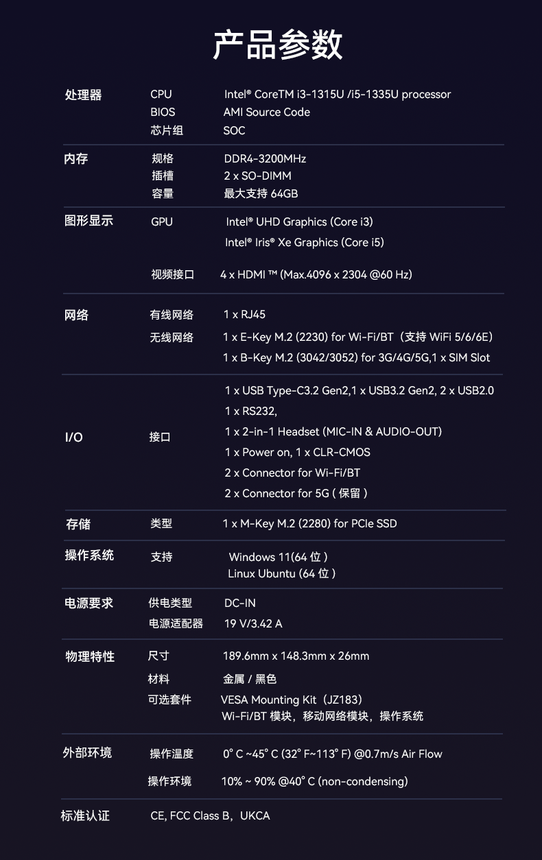 www.凯发科技D613采用英特尔Raptor Lake酷睿i3-1315U/i5-1335U 处理器,作为一款性能强悍的主机,它的TDP仅15W,能有效降低能耗,延长电池寿命。在内存方面,D613采用2 x SO-DIMM DDR4-3200 MHz,最大可达64GB,并配备1 x M-Key M.2 (2280) for PCIe SSD。