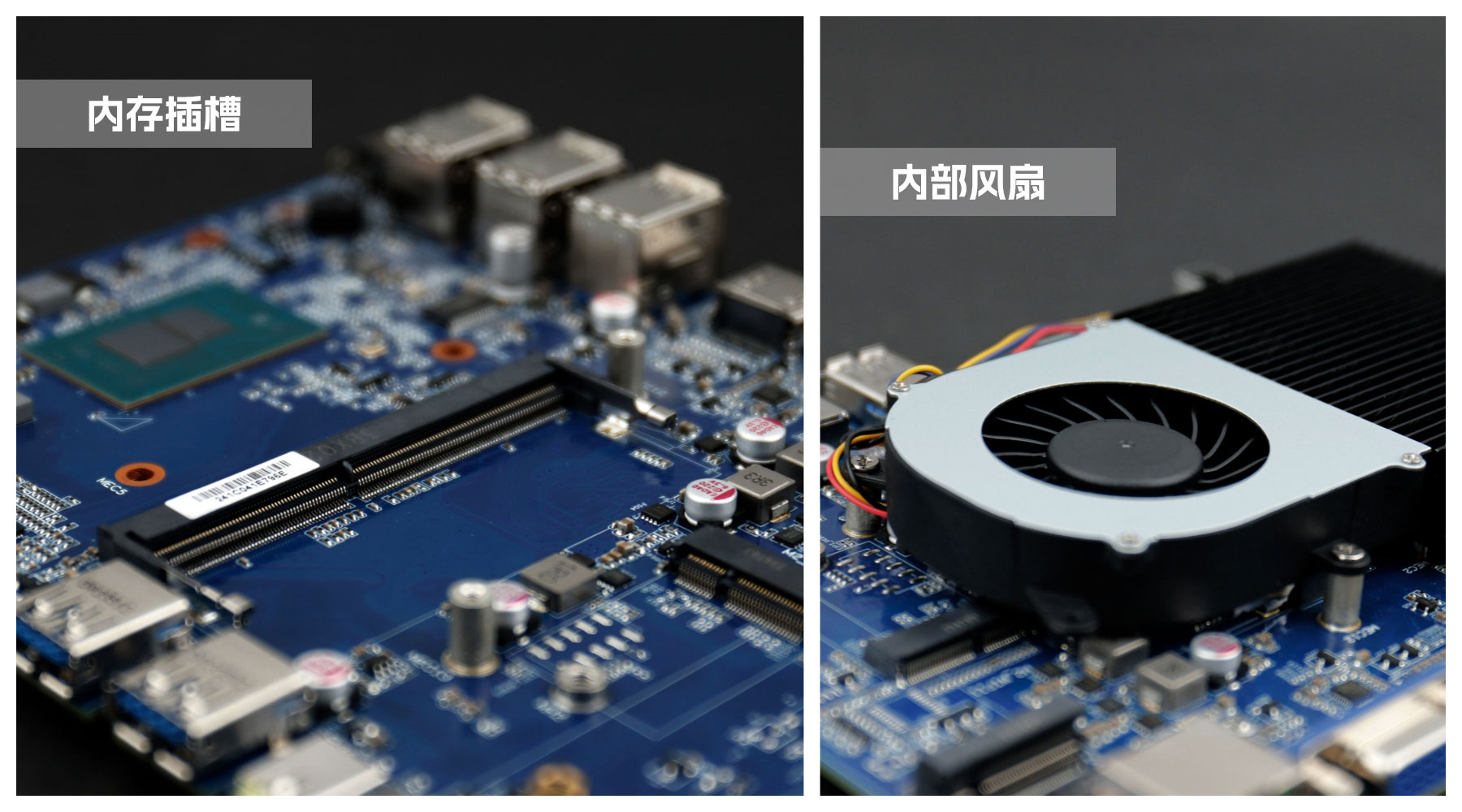 www.凯发桌面云终端Y-BOX S2主板中部是内存插槽,采用单通道笔记本内存槽设计,最大支持容量可达32GB,最高支持DDR4-3200MHz频率,横插的形式可以减少主板的占用体积,使整体机身更紧凑,内存顶部的风扇起到高效散热的作用。