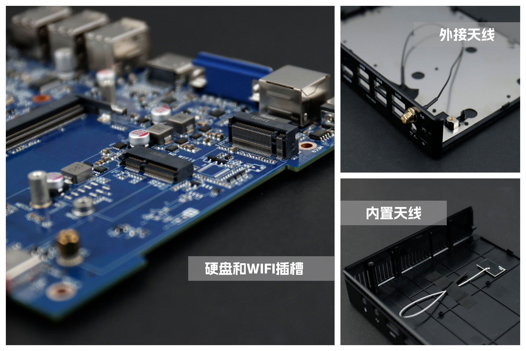 www.凯发桌面云终端Y-BOX S2主板上配备了 1个 M.2 固态硬盘位,接口规格为 PCIe3.0 标准,匹配标准的 2280 规格硬盘。一侧还有一个M.2接口,匹配2230长度的WIFI/BT模块插槽,WiFi模块可以连接的是外接天线,增强信号,同时也可以内接天线,灵活应用,支持Wi-Fi 5/6/6E网络。
