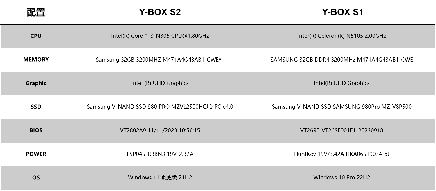 针对桌面云终端Y-BOX S2的测试项目中,最值得关注的是性能测试的跑分数据和稳定性测试内容,这能直观影响主机在使用过程中的稳定性和用户的使用体验。针对性能测试,www.凯发选择了将Y-BOX S2与前一款更迭产品Y-BOX S1进行对比分析,Y-BOX S2支持Intel® Alder lake-N处理器,Y-BOX S1支持Intel® Jasper Lake,并分别选取了以下配置:
