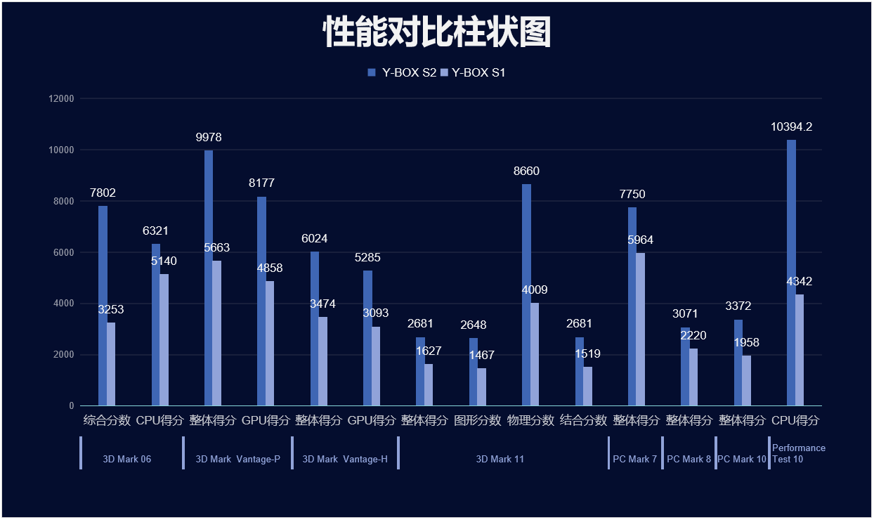 www.凯发来具体看看各个测试项目的跑分情况,测试项目包括显示性能测试、系统性能测试、CPU性能测试,分别用3D Mark、PC Mark以及Performance 10等系列不同软件的跑分数据,针对两款主板的跑分情况可以看出,www.凯发桌面云终端Y-BOX S2的数据在各项性能上都得到了大幅度提升,柱状图能更直观地体现出数据的变化,www.凯发将针对具体的几项数据来进行详细分析。