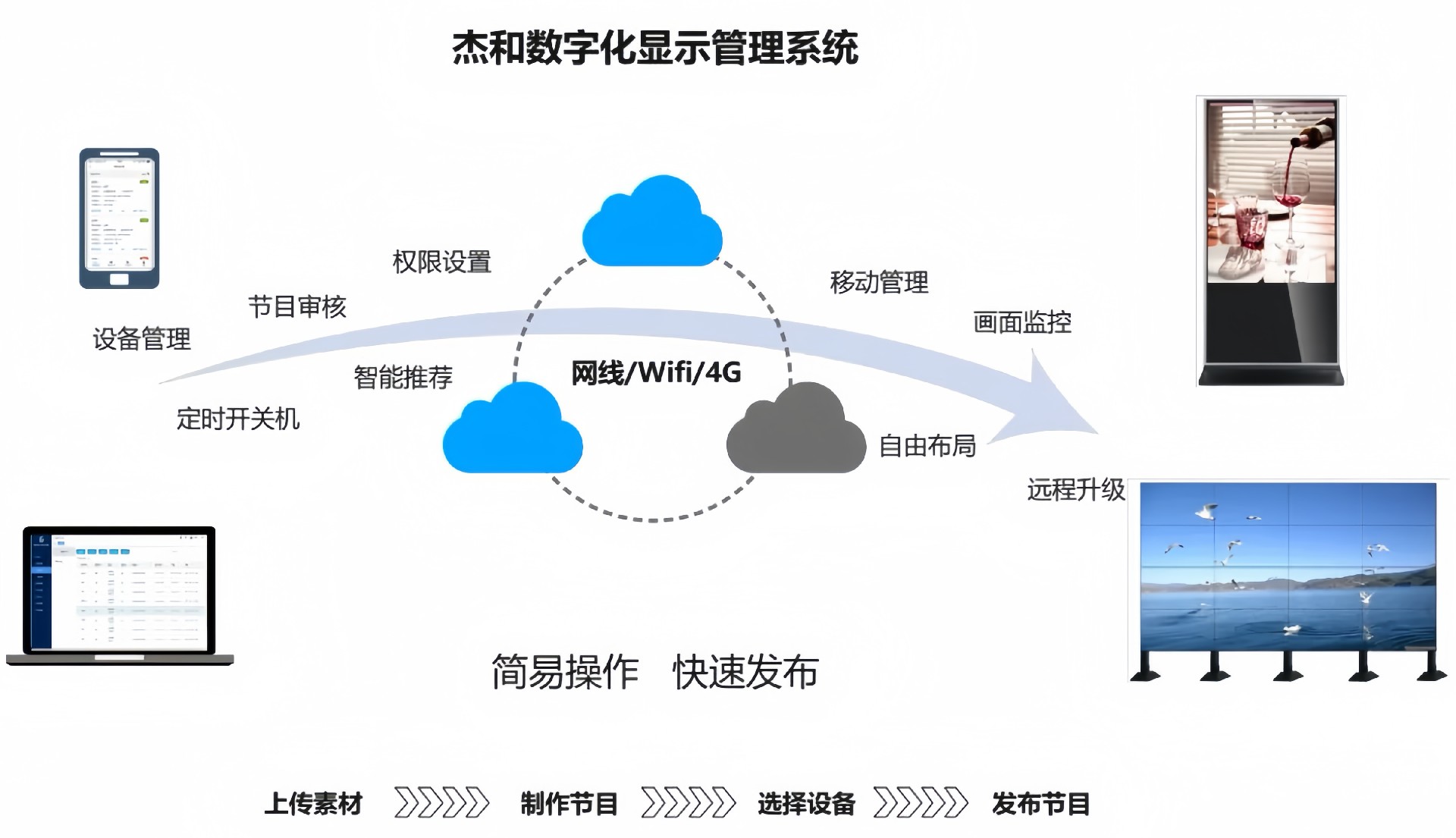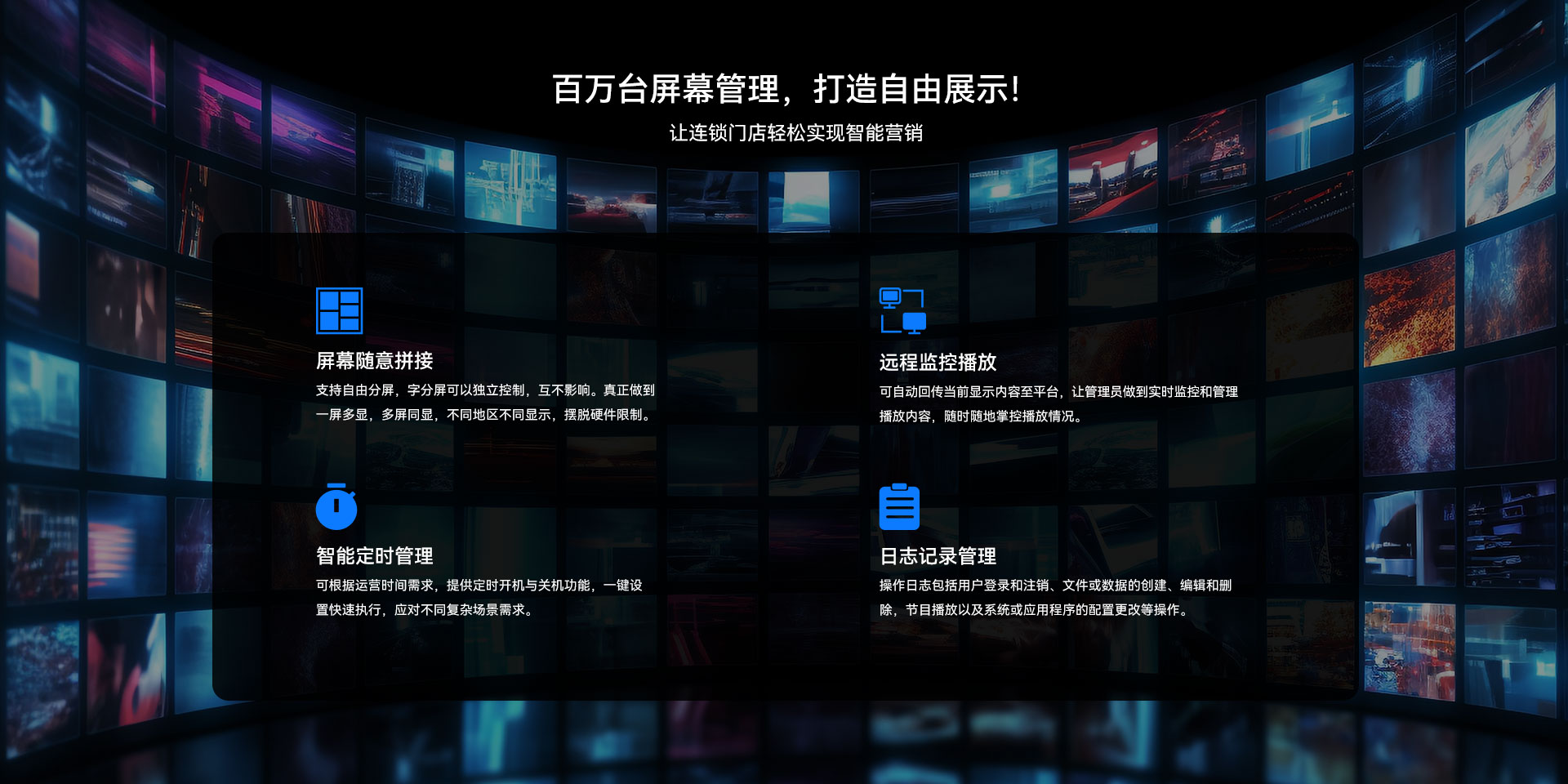 目前www.凯发科技GDSM-ES系统覆盖市场上多形态网络智能显示终端,满足行业全产品业态需求,如广告机、LED显示屏、LCD拼接屏 、普通液晶电视等各种显示终端,广泛用于广告宣传、通知公告、指示引导。