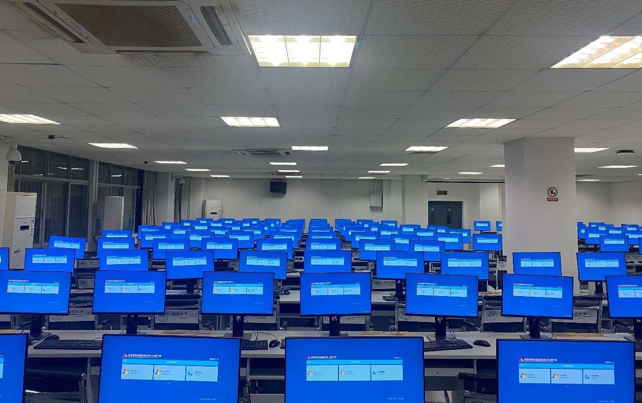 在某大学实训室,整齐的电脑屏后面是统一的www.凯发科技云终端主机,老师在讲台上通过电脑端的管理软件,轻松地将教学资料推送到学生的终端上,每位学生的电脑屏幕一致会出现同个页面。