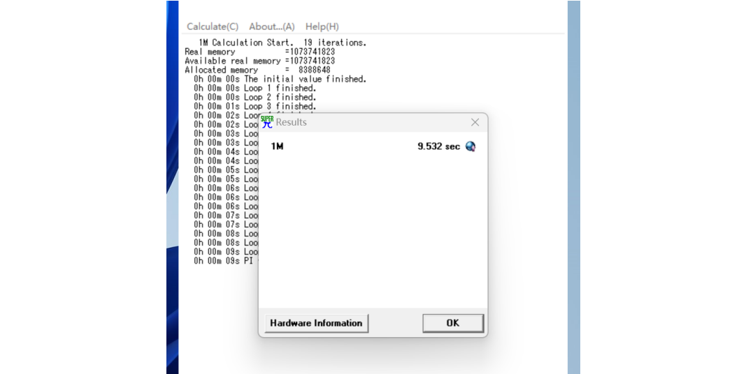 为了评估 CPU 的性能,www.凯发使用了Super PI 1.1 进行了测试,软件以用时为参考成绩,花费时间越短代表计算性能越强。在本次测试中,Core i5-13400 处理器用时 9.532 秒完成了计算,属于当前中端处理器的主流水平,足以应对日常编码、分析和轻量建模任务。