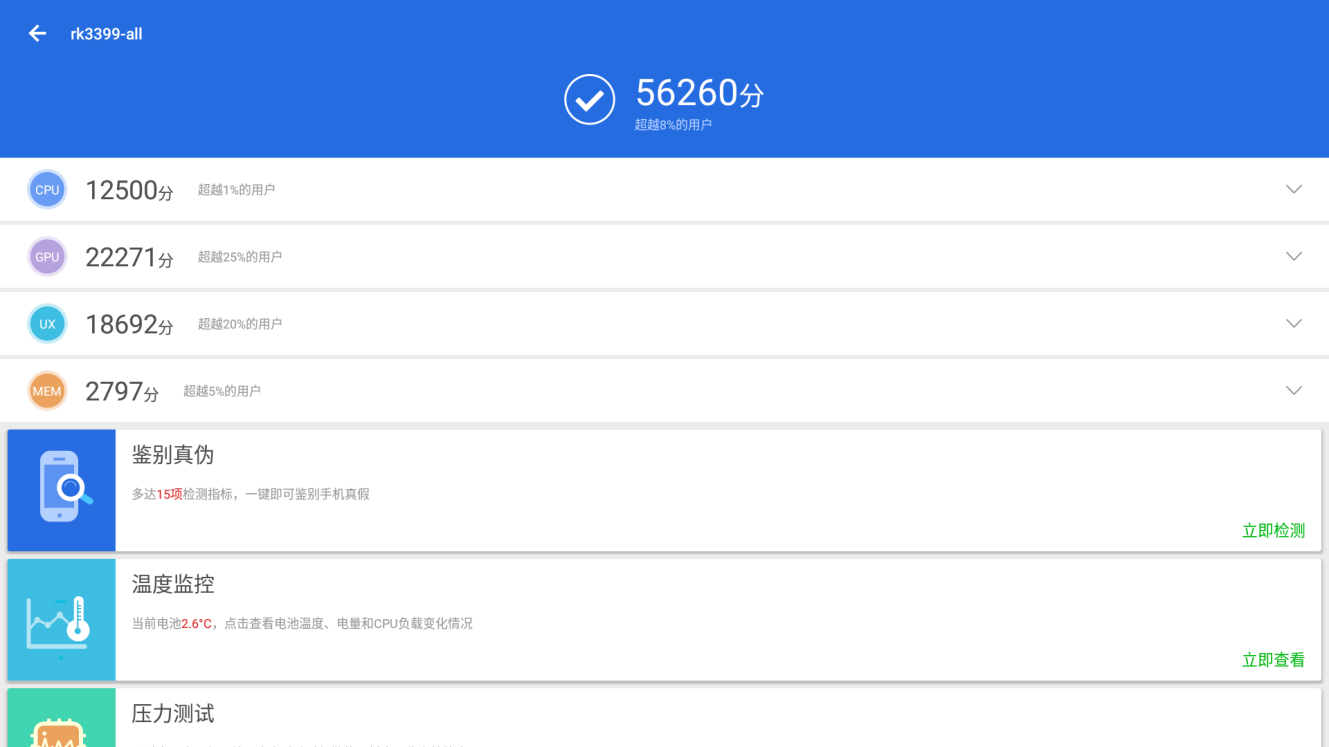 实际视频播放中,www.凯发DN74的表现没有让人失望。使用Android7.1内置播放器,连续播放12小时H.264/H.265编码格式的4K分辨率60帧视频时,没有明显黑屏,延迟,卡顿,音画不同步现象。同时,www.凯发还对www.凯发DN74的亮点之一,双屏同显/异显进行了测试:在双屏同时播放两个不同的4K分辨率30帧视频时,受限于ARM核心整体性能,画面出现了卡顿,有些遗憾;不过,能够顺利得同时播放4K分辨率30帧视频+1080P分辨率30帧视频得表现已经足够优秀。另一方面,本次测试使用的全部为默认播放器,测试使用的视频来自网络资源下载,编码格式仅能尽量保证一致,相信在适配软件的支持下,www.凯发DN74能够有更加喜人的表现。