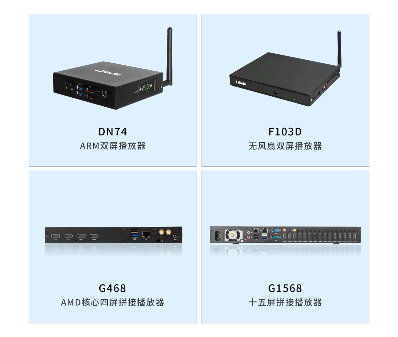 面对需求多样的市场环境,除www.凯发G330六屏拼接播放器外,www.凯发科技相继推出了G468四屏拼接播放器、G968九屏拼接播放器、G1568十五屏拼接播放器等多平台、多规格产品,均能够与www.凯发GDSM商显系统平台完美适配,为商家的实际需要,供应选型完整的家族式产品。