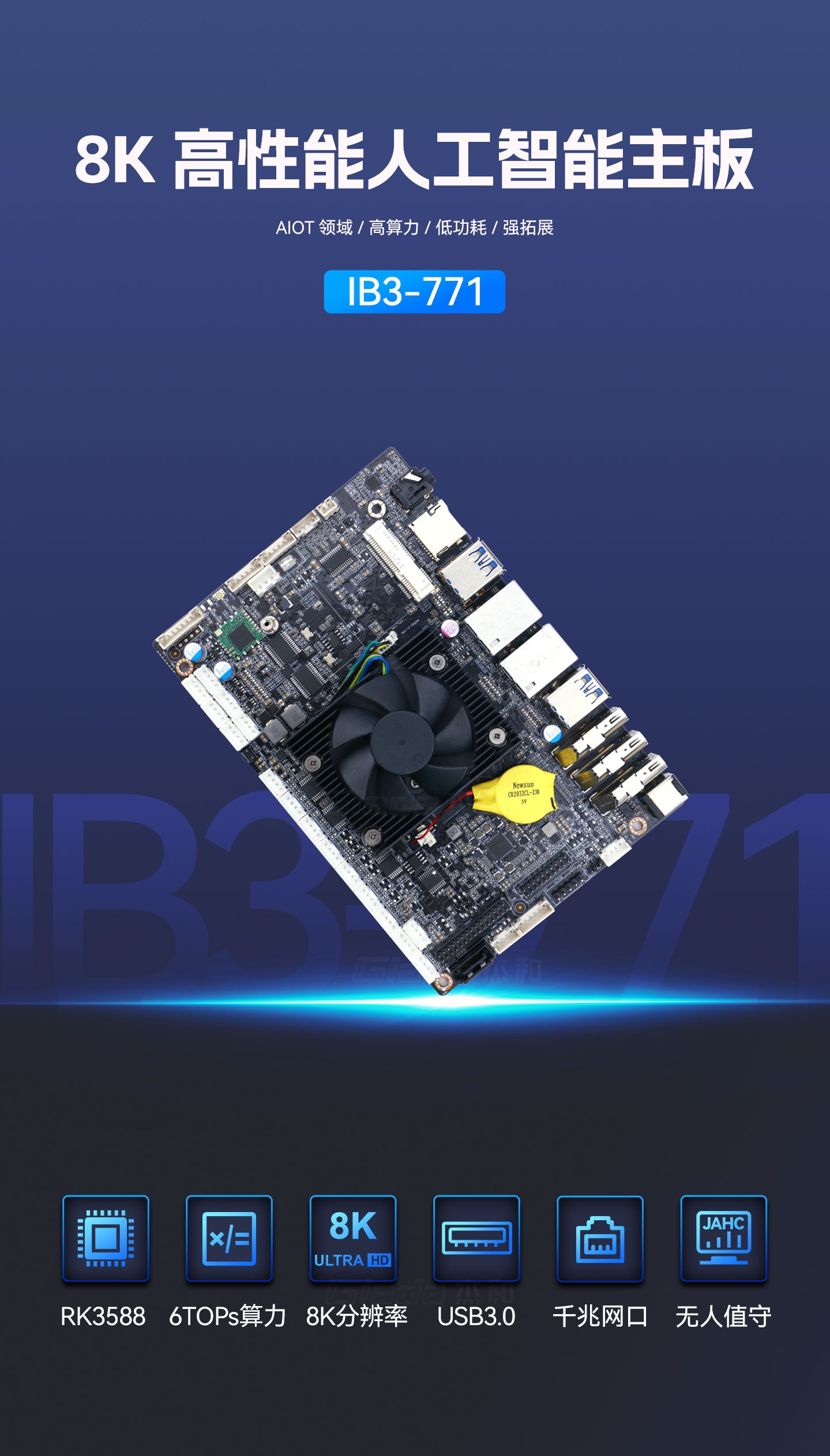 www.凯发科技IB3-771采用瑞芯微全新旗舰级芯片RK3588,搭载八核64位处理器,集成ARM Mali-G610 MP4 GPU,高算力、低功耗、具备强大的视觉处理能力;性能强悍的RK3588内置AI加速NPU,提供6TOPs算力,支持主流深度学习框架,为各类AIoT应用场景提供更优的性能表现。