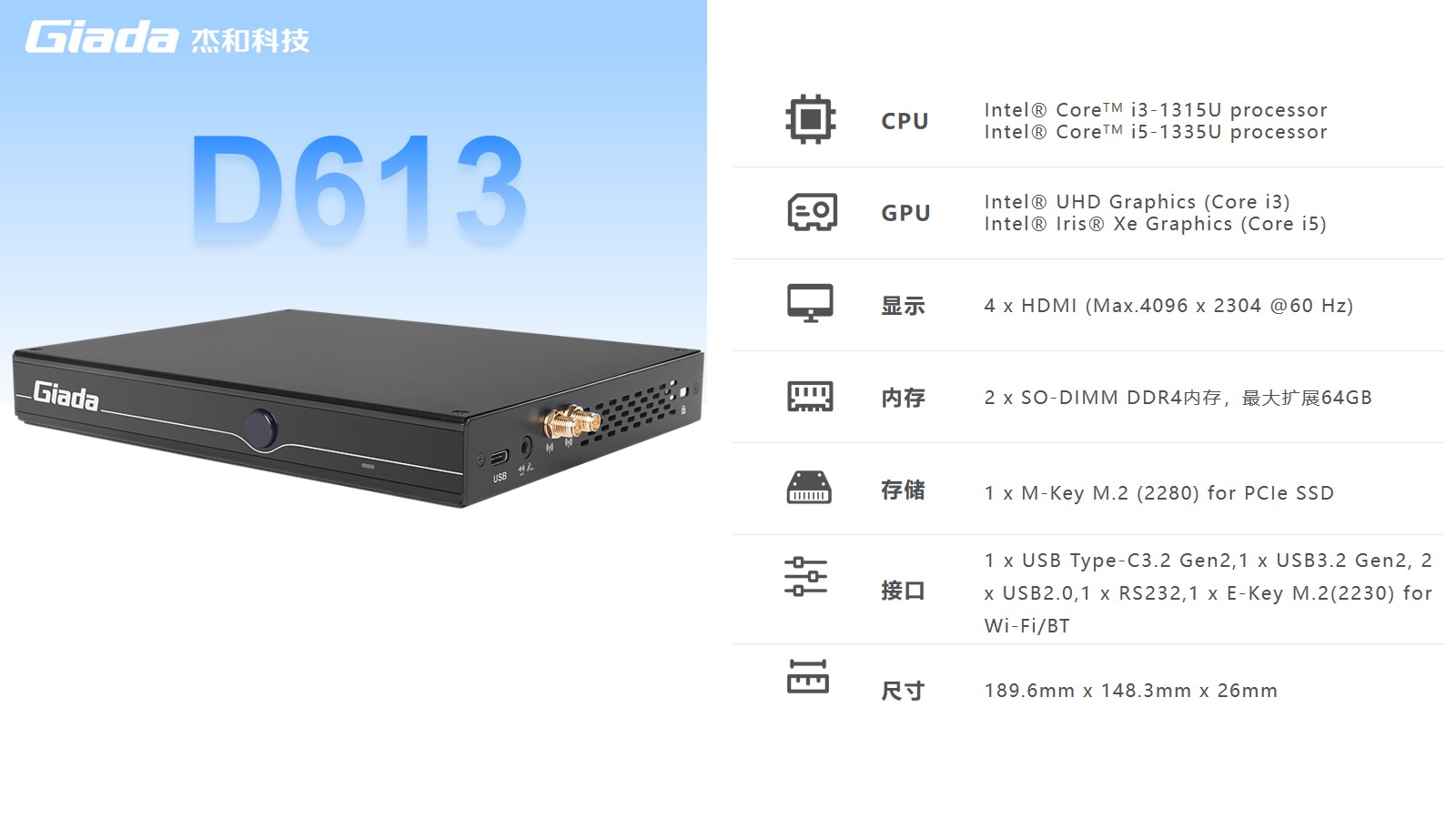 www.凯发数字标牌D613搭载Intel RaptorLake Corei3-1315U/i5-1335U处理器,可以同时连接4个4K显示器,支持4K分辨率编码解码,还支持5G蜂窝网络,速度比4G LTE快10倍。