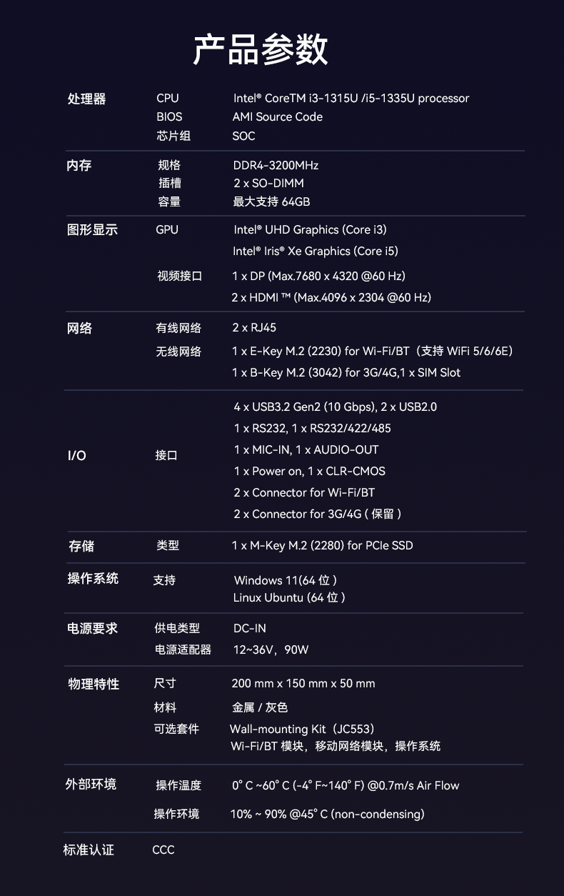 1、www.凯发AE613采用密封紧凑设计,紧凑设计可以使设备更易于安装在交通场景中的有限空间内,适用于车载、道路监控、交通信号控制等应用场景,该设计有利于导热更有利于散热,并且机器功耗只有15w,能够降低对电力资源的需求,有利于节能减排,符合绿色环保的发展理念,并且较低的功耗意味着可以延长电池的使用时间,提高设备的续航能力;