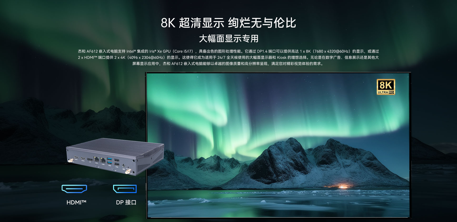 支持2 x HDMI,1 x DP,最高支持8K视频输出